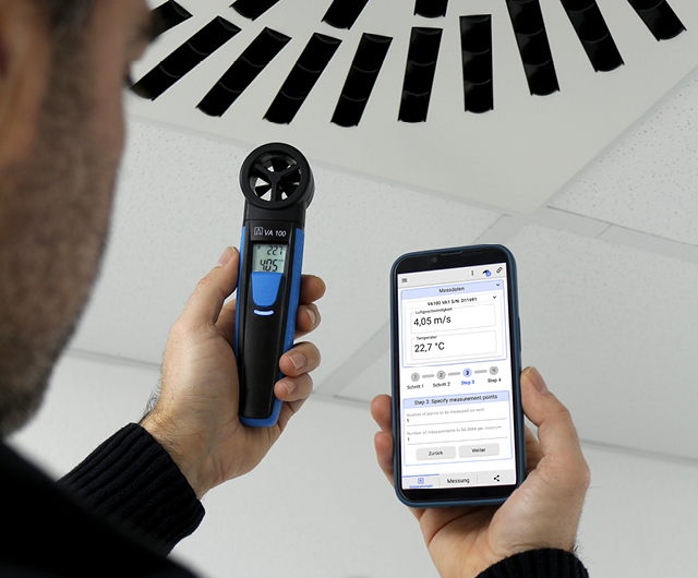 The VA 100 vane anemometer delivers precise air velocity and temperature measurements – including convenient volumetric flow calculation.